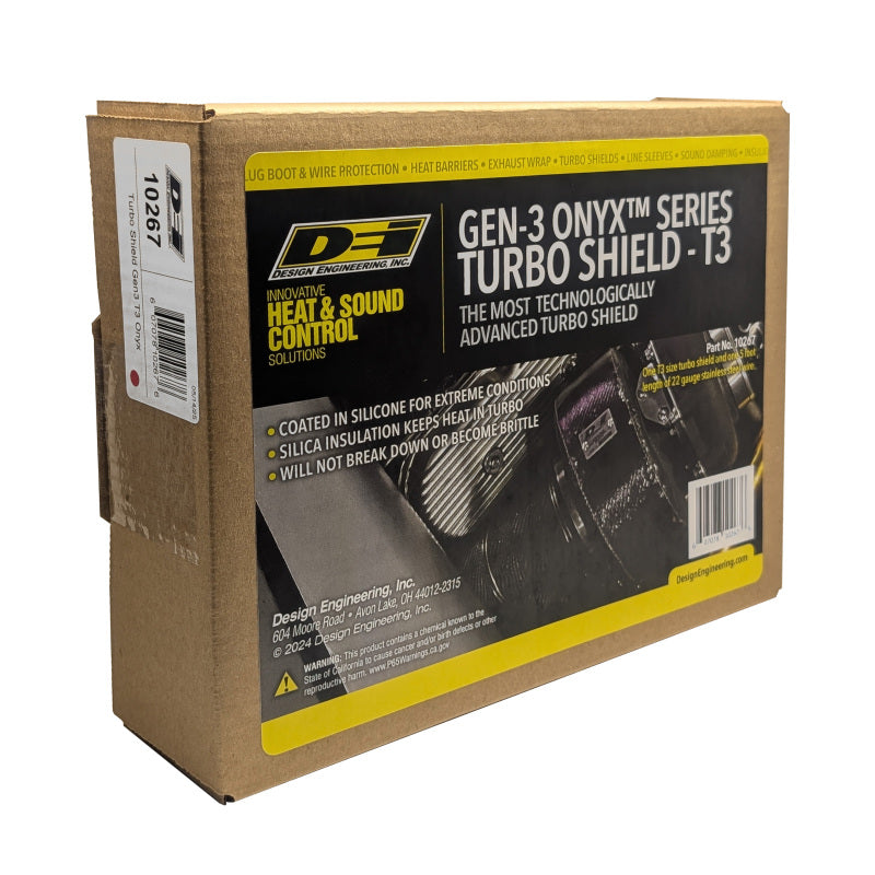 We raised the bar. The most technologically advanced turbo shield ever! We incorporated all our experience to build the absolute best turbo shield on the market. By developing advanced textiles and diving deep into what is needed to control turbo heat, we developed the GEN-3 Onyx Black Turbo Shield. A Silicone coated Onyx Black outer layer with multiple stainless steel and silica inner layers. Without a doubt the strongest, most heat resistant shield available. OUTER SHELL - Coated in silicone to insulate and hold up under extreme conditions. - Prevents fraying & encases seams to make them over 4 times stronger INSULATION LAYER - Thick layer of silica insulation keep heat in turbo shield and turbo housing. - Silica has a low thermal conductivity making one of the best insulators. INNER LAYER - Stainless steel, glass fiber & silicone adds to insulating and thermal properties. - Increases seam strength, durability and insulation value. INNER COVER - Stainless Steel fabric holds up against the highest temps. - Will not break down or become brittle with heat. Measuring your turbo size DEI Turbo shield sizes are based on two basic measurements. The first measurement is the circumference of the turbo not including the flange. The second measurement is the width of the turbo at it's widest point not including the flanges. After measuring, refer to the chart below to find the correct shield. Our T22 and T25/28 shields are designed for use on internally gated housings. They will have a cutout in the wastegate area to allow for a tight fitment. TURBO MEASUREMENTS CHART TURBO - CIRCUMFERENCE - WIDTH T22 - 15" - 2.25" T25/28 - 15" / 16" - 2.5" T3 - 15" / 16" - 2.5" T4 - 20" / 22" - 2.75" T6 - 26" - 3.75"